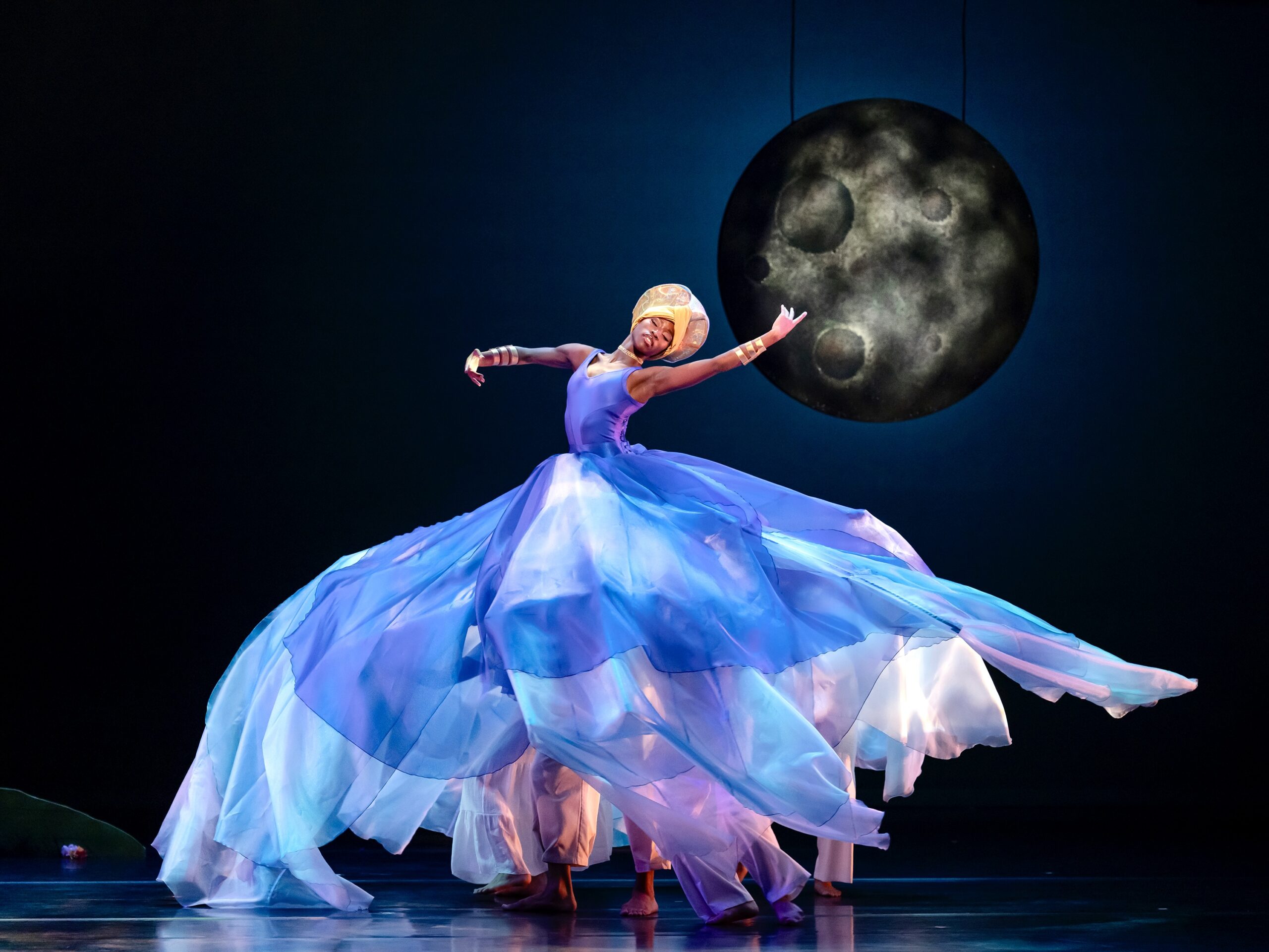 A rising and falling moon that showcased glistening craters and changing colors hung from semi-invisible wires.