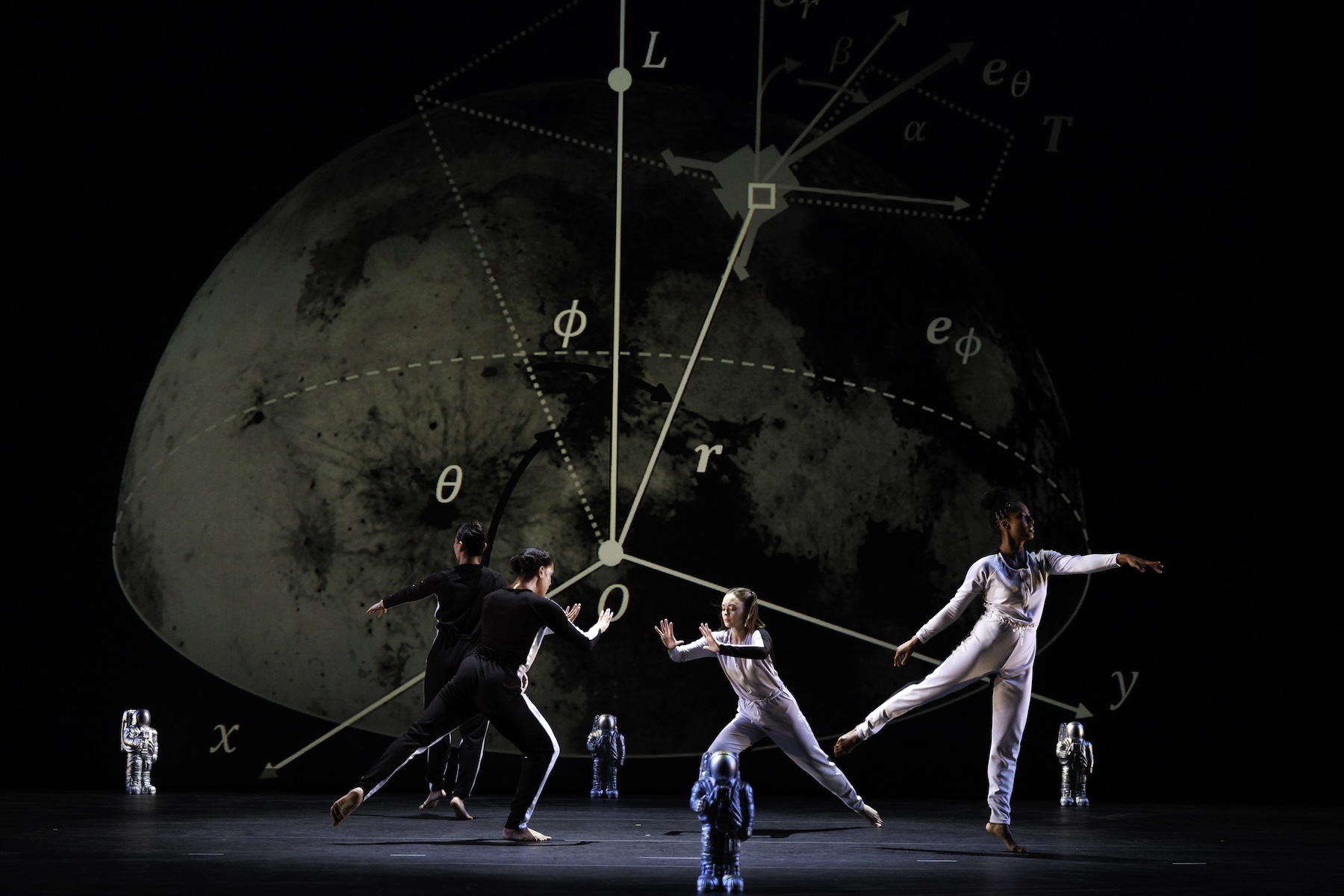 Mark Morris dancers perform in front of projection of the moon and a geometric design, ringed by miniature astronaut figurines. Photo by Xmbphotography.