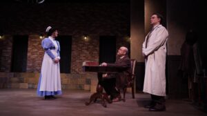 The entire cast of seven are outstanding, weaving that tapestry together with wonderful colors and textures. Most notable are Peter Giessl as Dr Evans, Mark Colley as Dr Watson and Katelyn Brackney as Matron. Each of the “Holmes” characters are well-represented by Will Johnson (Holmes #1), Joseph Tobin (Holmes #2), and perhaps the most surprising of all, Aaron Barnes (Holmes #3). And last but certainly not least, Michael Zois as the unassuming Orderly.