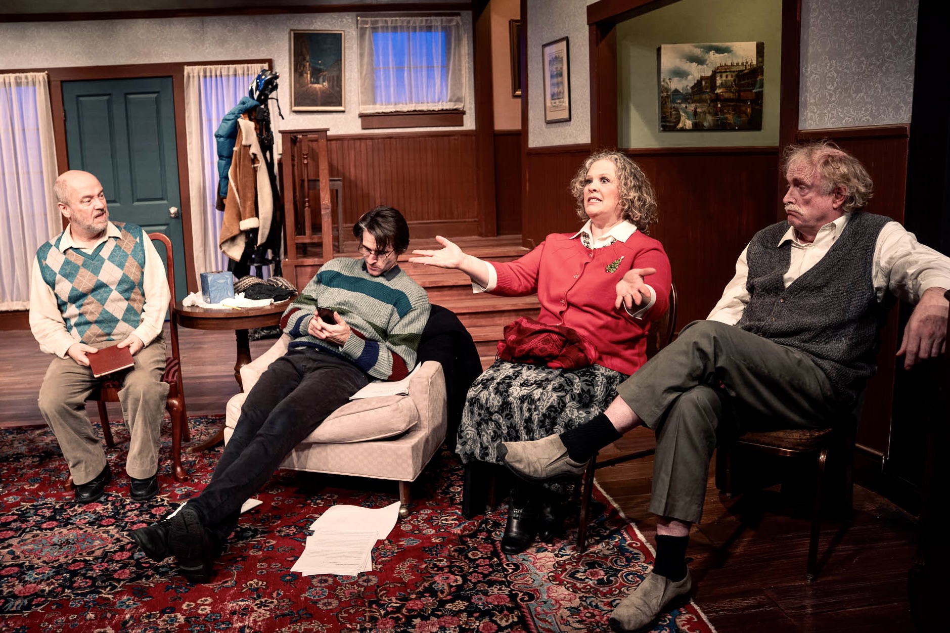 Conrad Cady, Tyler Null, Alicia von Kugelgen and Simon Patton are excellent in Masquers Playhouse’s production of Improbable Fiction.” (Mike Padua via Bay City News)