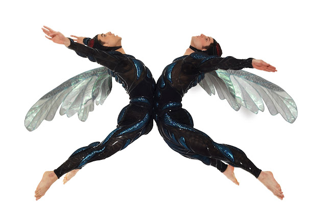 Stylish décor and Costumes designed by Santo Loquasto added to the creativity and playfulness – the men in shimmery sleek black and turquoise metallic detailed body suits, headdress caps and beautiful glistening gossamer wings –the women in shimmery leaf green metallic body suits, headdress caps and glistening white wings. Décor by Loquasto and warm dramatic lighting by Jennifer Tipton provided a wondrous atmosphere for these insects with a backdrop of a huge circular castle surrounded by the silhouettes of trees with wiry branches, evoking the dark of night when fire-flies play.