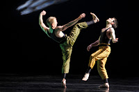 “Gossamer Gallants” choreographed by Paul Taylor premiered in November 2011. Presented for the first time in Paris by Les Etés de la Danse – it is playful, fresh and tells the story about fire-flies and how they pair up, the females searching for their gossamer gallant. The movement of the fire-flies was authentic with quivering arms and hands with quick changes of directions, leaps and symmetry to musical extracts by Bedrich Smetana. Humorous moments of brief acrobatic moves folded into the movement or competition as the males vied for the females were well received.