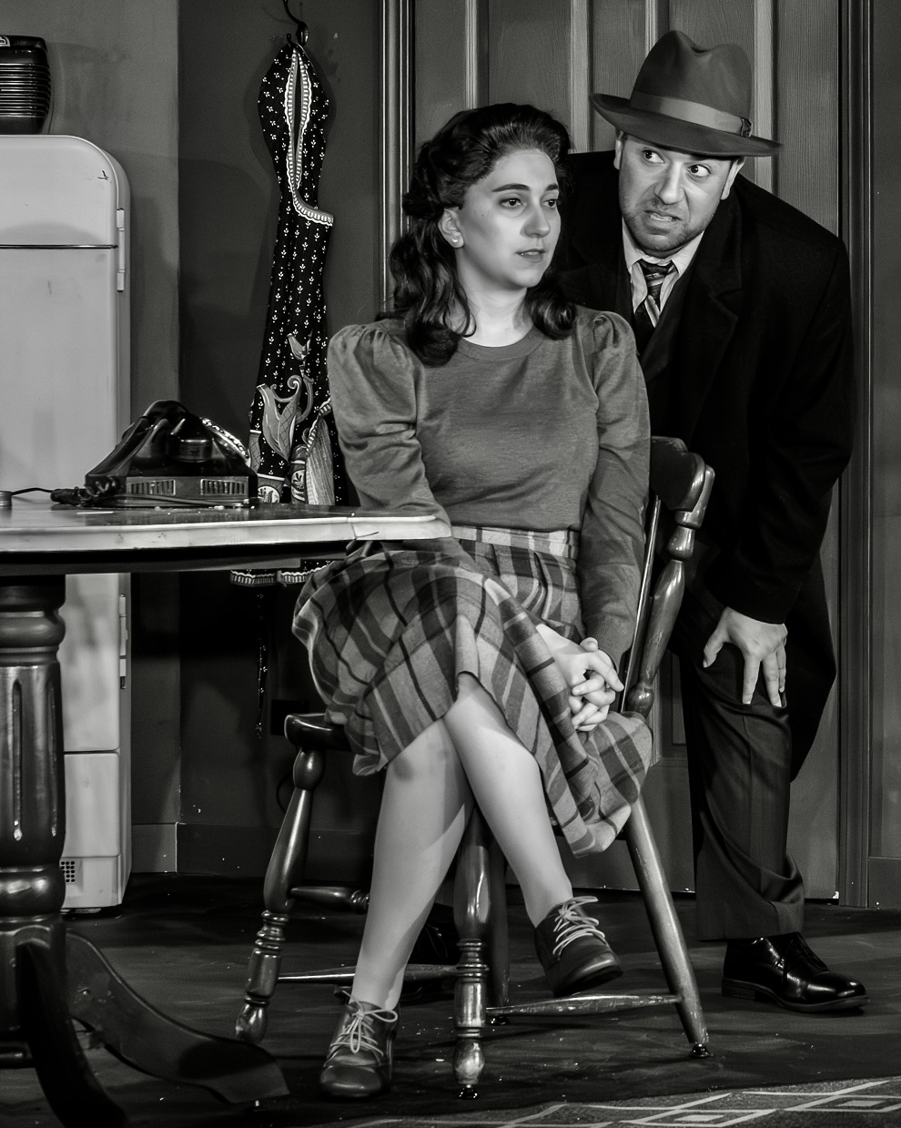 It takes almost no time for costumes and furniture that could have existed in the World War II era to quickly pull the audience into the basement digs in Greenwich Village. Gifted sound cues by Billie Cox and equally perfect lighting designed by Frank Sarubbi pinpoint a noir atmosphere that cinematic classics from director Alfred Hitchcock and Hollywood power couple Humphrey Bogart and Lauren Bacall honed.