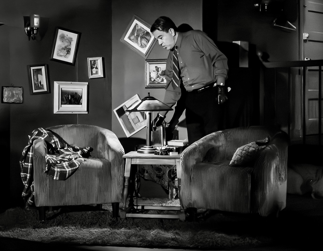 A leather-gloved Roat (David L. Yen) leaves no fingerprints while searching for a valuable doll. Photo by Robin Jackson.